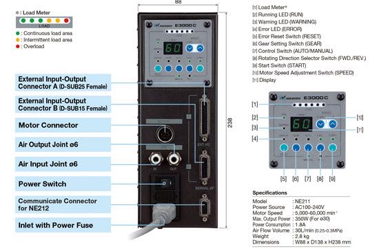 NSK E3000 Series, 1.18”, 0.98”, 0.79” spindle diameters, modular type best for gang tool applications. Maximum rpm: 60,000, with a maximum power of 350 watts. The control unit can run one spindle, and with the addition of the selector unit, you can run up to four spindles. We have tool holders for mounting in radial, axial, and vertical directions. Call to discuss your requirements for a low-cost live tool approach.